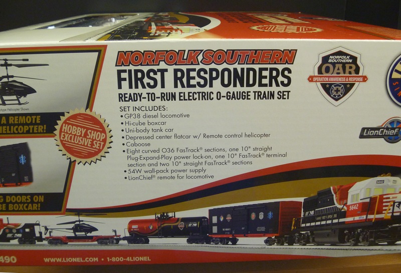 This train was inspired by the Norfolk Southern First Responders safety train that was launched in 2016 and making its way through out the eastern part of the country. Included in this set is everything you need to get started, including the remote-control helicopter on the depressed center flat car. Also included in the set are: